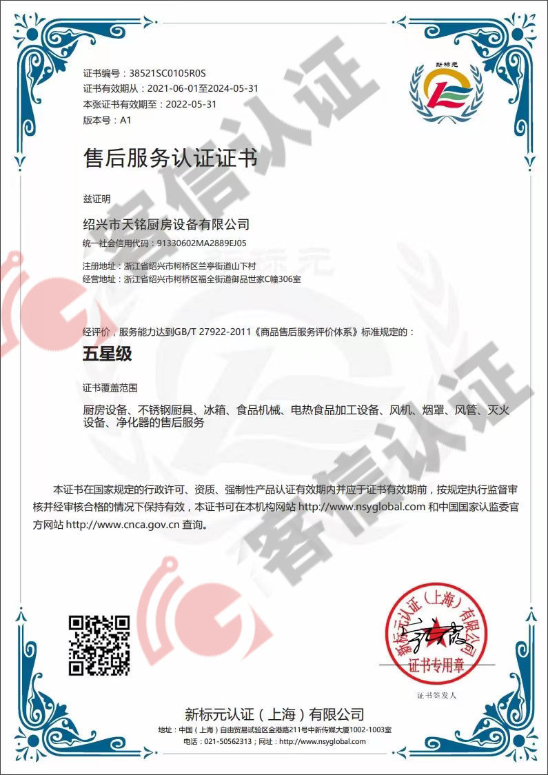 恭喜紹興市天銘廚房設(shè)備有限公司獲取售后服務(wù)認(rèn)證證書